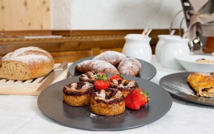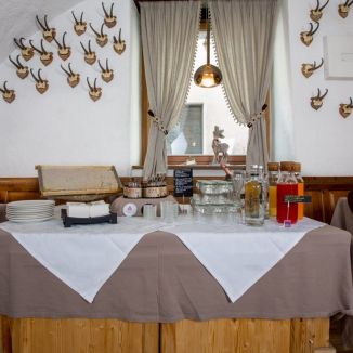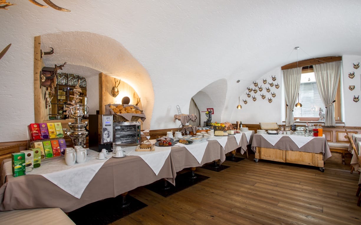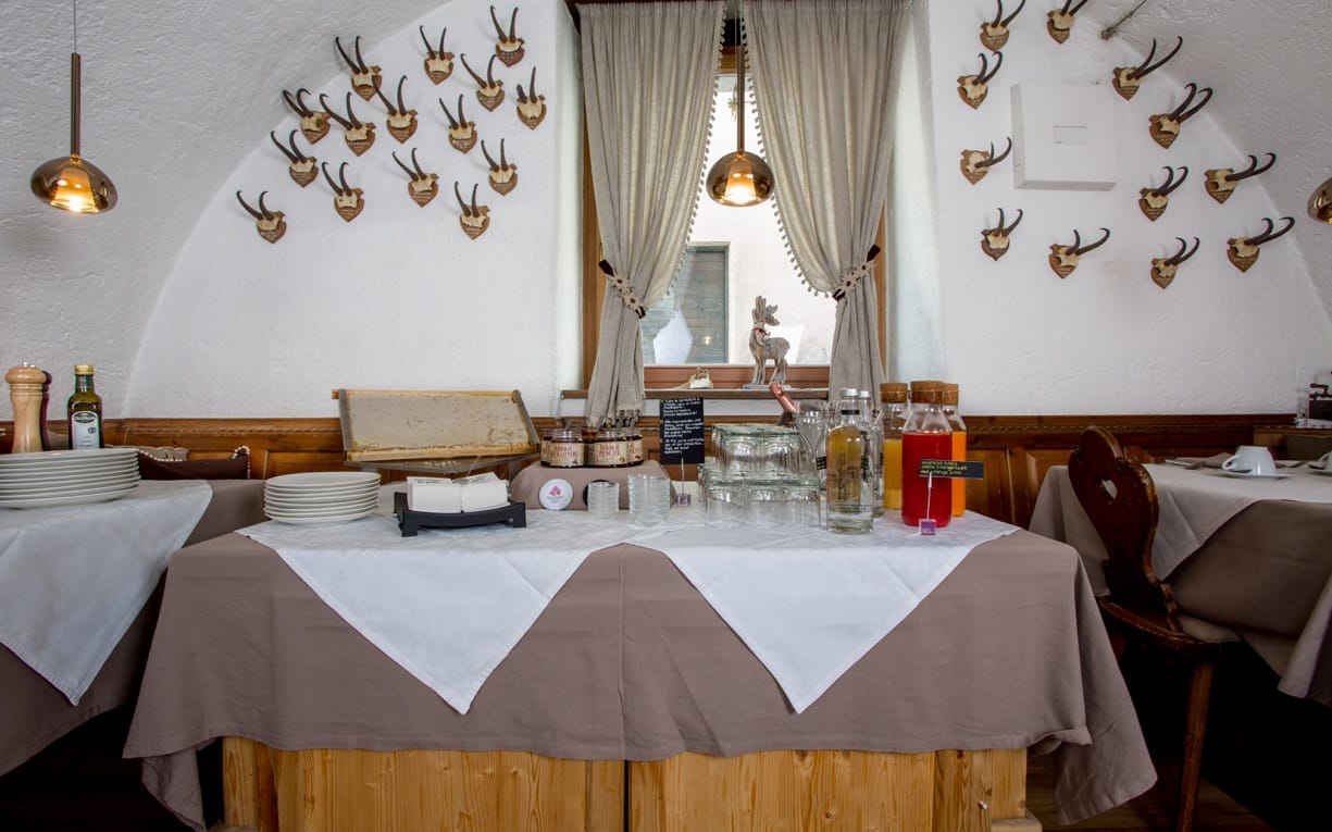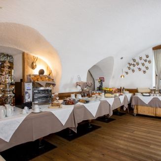 Der Übergang von Ihrem Zimmer zum Bracconiere Saal (der Büfett-Saal) ist etwas Besonderes, Beruhigendes und Gemütliches und es lädt Ihnen ein, ein reichliches Frühstück zu machen. Ein reichliches Büfett mit hausgemachten Kuchen, Keksen, Marmeladen Enrosadira. Joghurt, Milch, Butter und frische Käsesorten, alles aus den Almen, wo die Landwirte jeden Tag hart für uns arbeiten. Im Laufe der Jahre haben wir immer mehr auf Qualität, Ursprung, Saisonalität und Nachhaltigkeit der Produkte gesetzt. Süß und salzig, Schokolade, Speck und Schinken, frisches Obst ... Wir wählen alles persönlich aus. Eine andere Art und Weise um Ihre Seele zu ernähren.